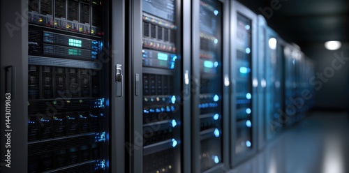 Dimly lit server corridor with glowing blue indicators and reflective floors, showcasing modern IT infrastructure, data processing power, and cloud technology in a secure environment