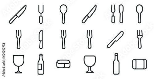 Dining and cooking outline icons set – flat, linear, culinary and kitchen symbols