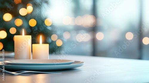 Dining Elegant dining table set with candles, plates, and fine silverware for a formal meal.