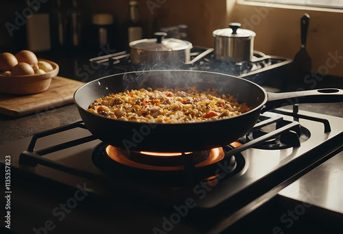 Dinner in Progress: A close-up shot of a sizzling skillet filled with a fragrant, colorful dish, creating a tantalizing aroma that invites you to the table.