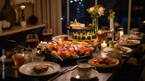 Dinner Table Setting with Delicious Appetizers, Wine and Candlelight