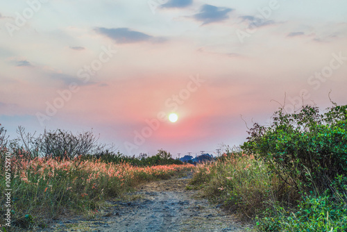 Dirt road between bushes and flowering grass with a sunset background