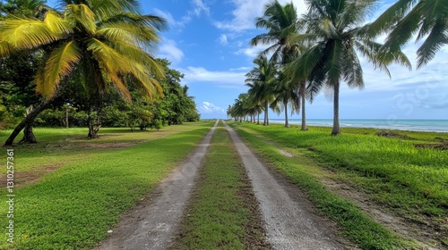 Dirt road lined with palm trees and grass, creating a serene and natural landscape.