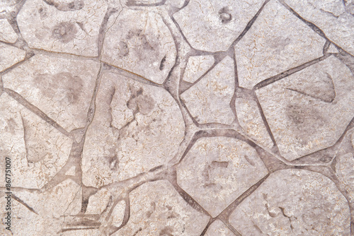 Dirty crazy paving floor texture background. Unclean cracked stamped concrete surface. Grunge and rough backdrop.