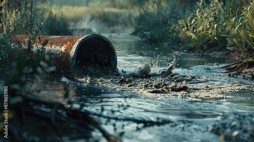 Dirty water wastes discharged through rusty pipe into the river. Pollution and environmental ecology protection concept