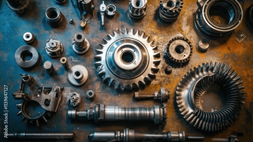 Disassembled turbine and compressor rotors on a technician workbench, with gears, blades, and other components laid out for detailed inspection and repair.