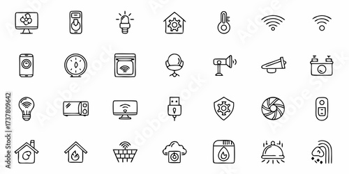 Discover a collection of smart home device icons perfect for illustrating home automation, IoT, and modern living in tech savvy designs for connected homes