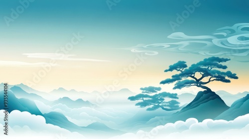 Discover the calm beauty of a foggy landscape, where pine trees meet the sea in a vibrant flat design style.