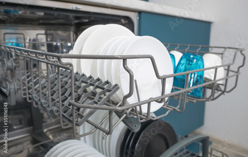 Dishware (plates) inside built-in dishwasher, . Dishwashing machine rack