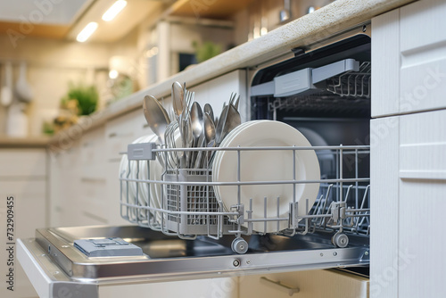 Dishwasher with lots of plates and silverware inside, seen from the side