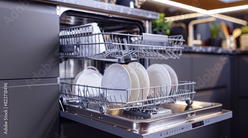 Dishwasher with open door clean dishes warm kitchen lighting.