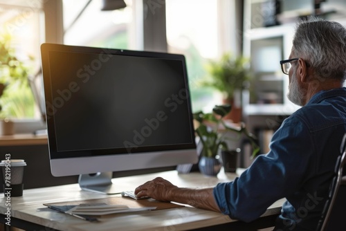 Display mockup from a shoulder angle of a senior man in front of a computer with an entirely black screen