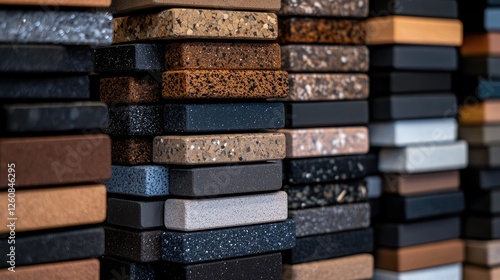Display rack features a variety of ceramic tile samples in shades of gray and black, perfect for modern flooring styles