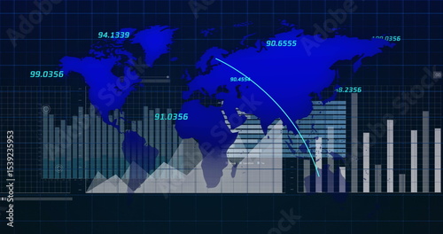 Displaying digital world map showing data visualization on dashboard, with bar charts and arrow