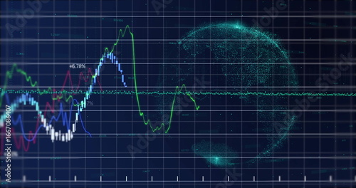 Displaying fluctuating colored graphs with percentages on dashboard, with glowing particle cluster