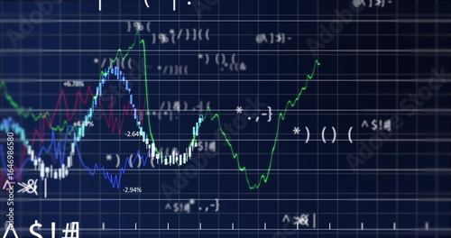 Displaying multi-line chart shifting on digital display, with colored candlesticks and symbols