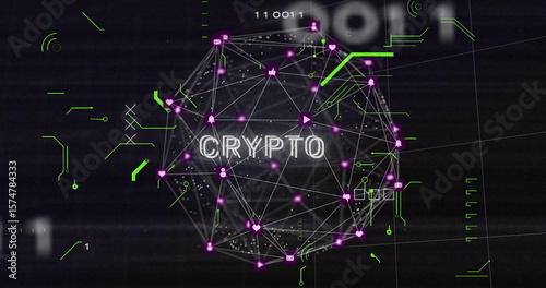 Displaying wireframe Crypto network sphere rotating in tech interface, showing purple social nodes