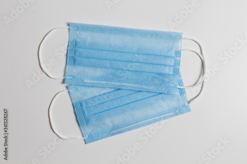disposable medical masks in blue with elastic bands with a nose clip on a white background