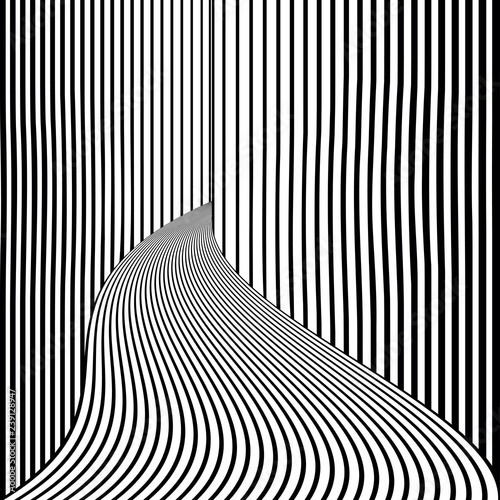 Distorted lines. ong corridor, door, vertical and horizontal stripes. Vector optical illusion. Black and white squares.