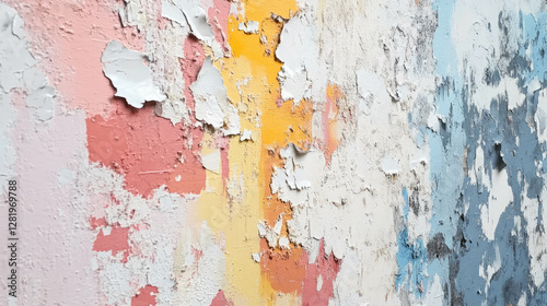 Distressed wall texture with colorful peeling paint layers for creative design projects