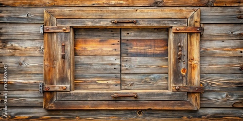 Distressed wooden window frame with worn wooden planks and rusty hinges