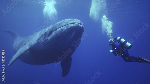 Diver exploring deep sea with giant whale, breathtaking encounter