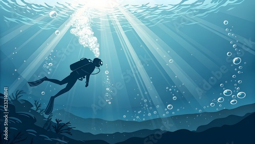 Diver Exploring Underwater World with Sunlight Rays and Bubbles