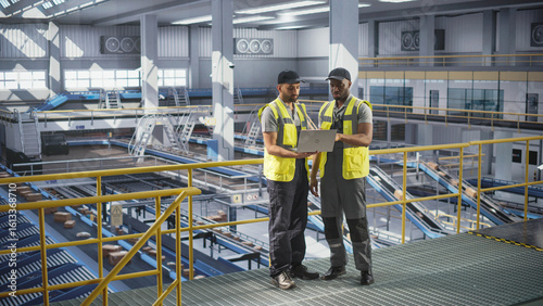 Diverse African and Multiethnic Arab Men Using Laptop Computer to Manage Automated Conveyor Belt Load, Prepare Online Shopping Orders for Delivery. Warehouse Associates Having a Conversation at Work