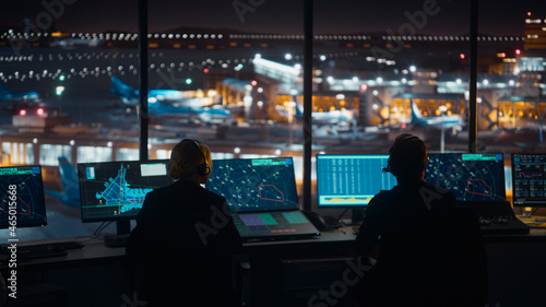 Diverse Air Traffic Control Team Working in a Modern Airport Tower at Night. Office Room is Full of Desktop Computer Displays with Navigation Screens, Airplane Flight Radar Data for Controllers.