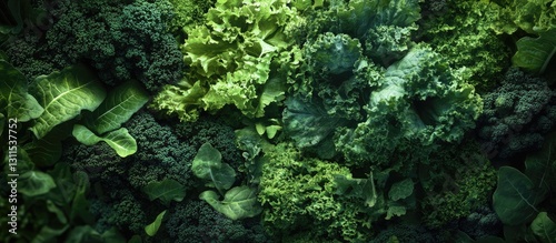 Diverse assortment of mixed greens features curly kale flat leaf kale romaine lettuce and green leaf lettuce in various green hues top view arrangement