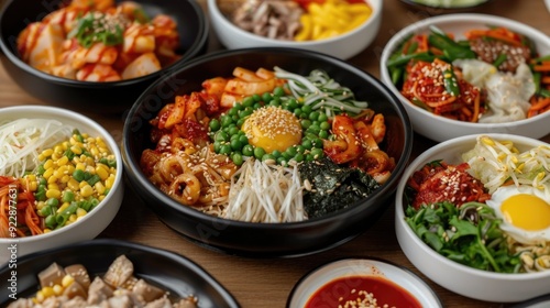 Diverse assortment of tempting Korean delicacies and traditional dishes elegantly presented on a table with a deep depth of field creating a cozy and inviting culinary atmosphere