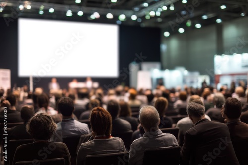 Diverse audience attentively listening to a presentation at a large conference. The bright screen illuminates the room.
