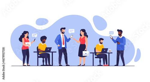 Diverse business professionals collaborate and communicate digitally in a modern office setting. Illustrates teamwork, productivity, and contemporary workflow.