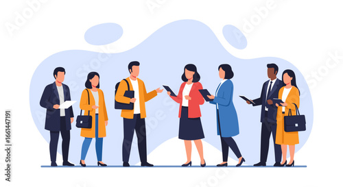 Diverse business professionals collaborating and discussing ideas in a modern corporate setting. Ideal for themes of teamwork, communication, and global business solutions.