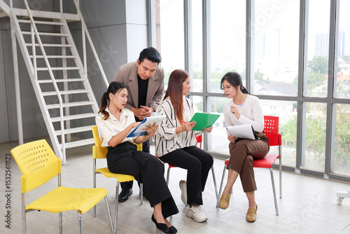 Diverse Business Team Brainstorming and Discussing Ideas, Young Asian Professionals Collaborating in Modern Office, Casual Business Meeting, Colleagues Sharing Insights