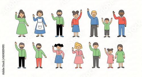 Diverse Cartoon People Waving on White Background Illustration of Families and Individuals.