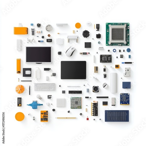 Diverse Collection of Electronic Components and Devices Laid Out on a Clean Surface for Technology and Design Backgrounds Featuring Modern Gadgets and Accessories