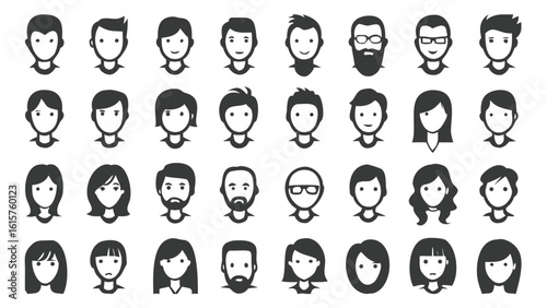 Diverse Collection of Minimalist Avatar Icons Representing Various Genders, Hairstyles, and Facial Features for User Profiles or Design Elements