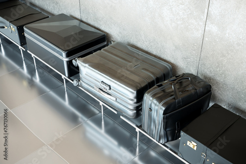 Diverse Collection of Modern Suitcases on a Metal Storage Shelf
