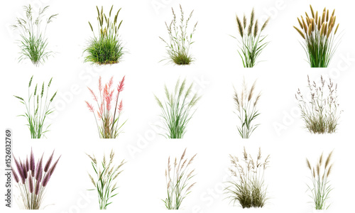 Diverse Collection of Ornamental Grasses in Various Shades and Textures for Natural Landscaping and Floral Design. Large Multiple Plant and Nature Collection Set Isolated on Transparent Background