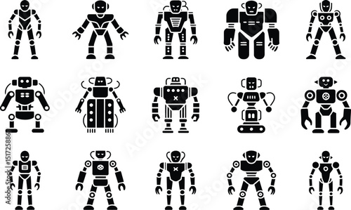 Diverse collection of vector robots silhouettes ideal for science fiction and futuristic technology designs