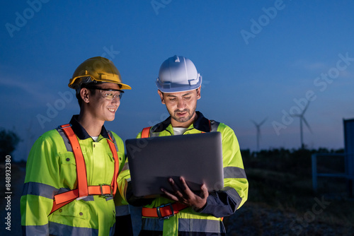 Diverse ethnicity male technicians working in the wind turbines field.
