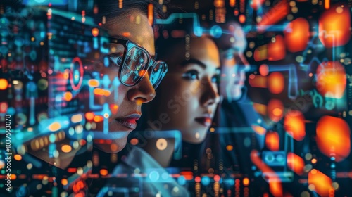 Diverse global workforce connected through technology, focusing on data analysis, customer service, and outsourcing strategies