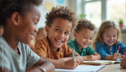 Diverse group kids learning classroom. Children of different backgrounds engaged in activities. Inclusive education. Joyful faces, smiling during lessons. Friendship. Happy kids studying together.