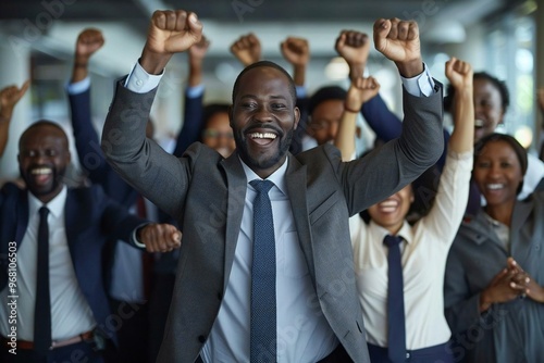 diverse group of adults from various African backgrounds coming together to celebrate their success and teamwork in the workplace.