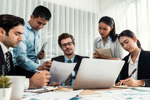 Diverse group of business analyst team analyzing financial data report paper on office table. Chart and graph dashboard by business intelligence analysis for strategic marketing planning Meticulous