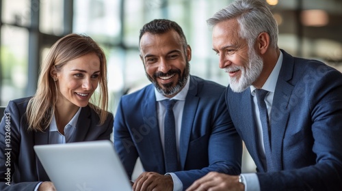 Diverse group of business people smiling and looking at a laptop screen during a meeting.