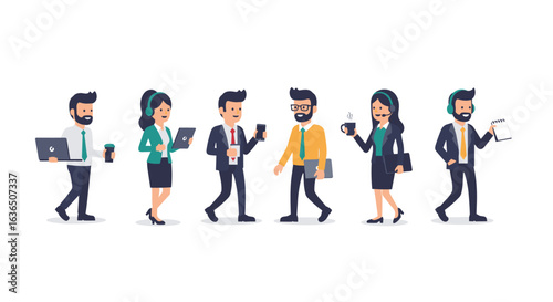 Diverse group of business professionals walking and working