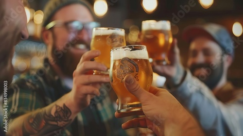 diverse group of friends enjoying happy hour at a brewery sharing laughter and pints of beer
