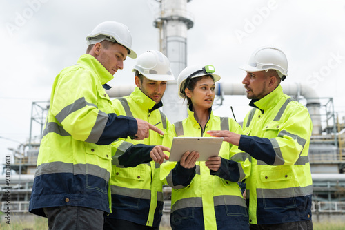 Diverse group of petrochemical engineers looking at on tablet and discussing inspection and maintenance plans for pipelines for oil and gas at petroleum refinery, power plant energy industry.